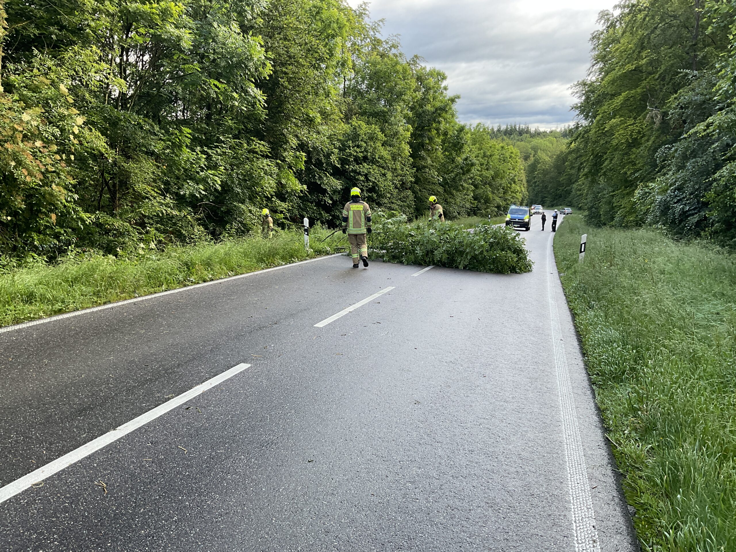 Vor Ort drohte ein Baum auf die Fahrbahn zu stürzen. Die Feuerwehr fällte den Baum kontrolliert und zersägte ihn im Anschluss, um die Straße freizuräumen.