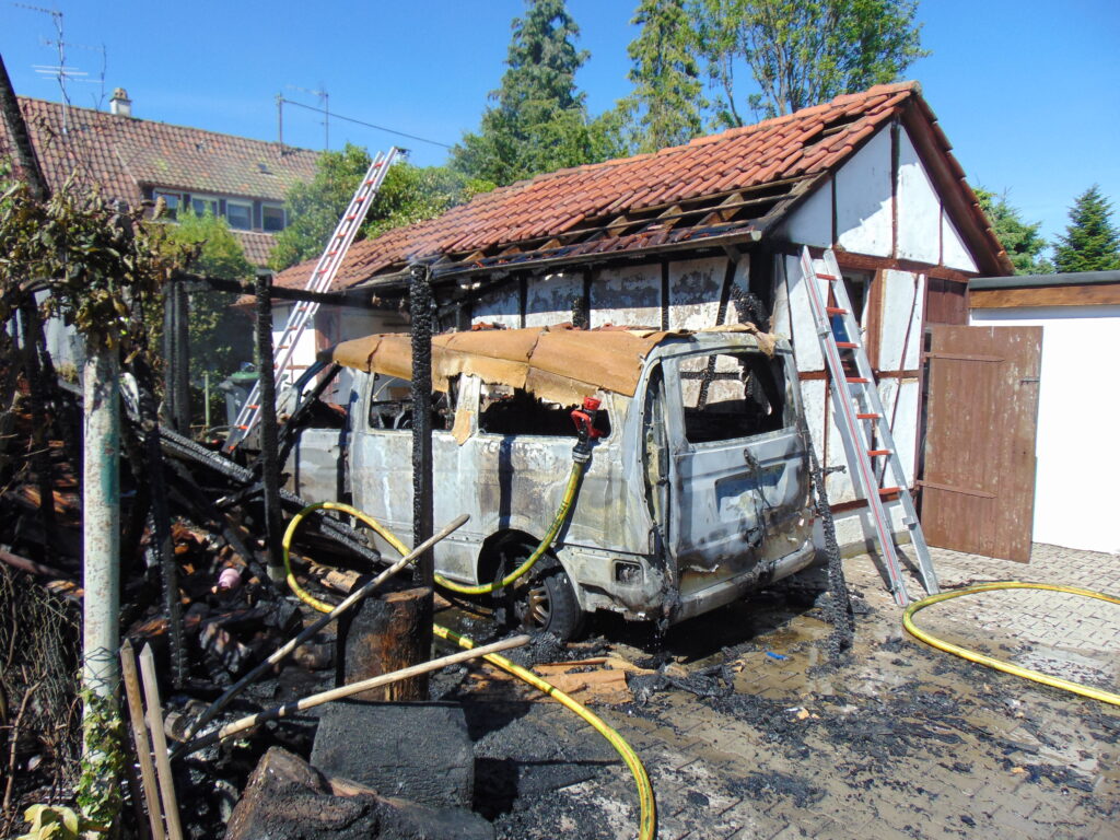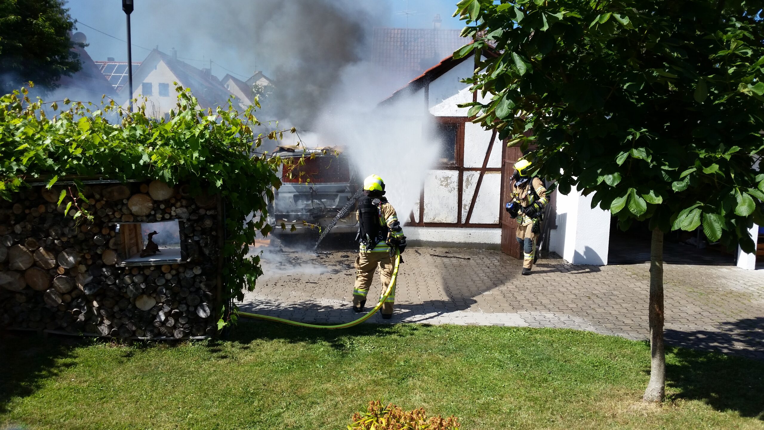 Aus bislang ungeklärter Ursache fing ein Carport samt Hecke und gelagertem Holz Feuer. Das Feuer griff schnell auf das im Carport befindliche Fahrzeug über, welches im Verlauf vollständig ausbrannte. Durch das schnelle Eingreifen konnte jedoch ein kompletter Übergriff des Feuers auf die benachbarte, eng angrenzende Garage erfolgreich verhindert werden. Es wurden drei Trupps unter schwerem Atemschutz mit insgesamt 3 C-Rohren eingesetzt. Im weiteren Verlauf musste der Holzstapel auseinandergezogen werden, um weitere Glutnester ablöschen zu können. Ein Teil des Ziegeldaches der angrenzenden Garage musste ebenfalls abgedeckt werden, um die Balkenkonstruktion ablöschen, bzw. weiter abkühlen zu können.