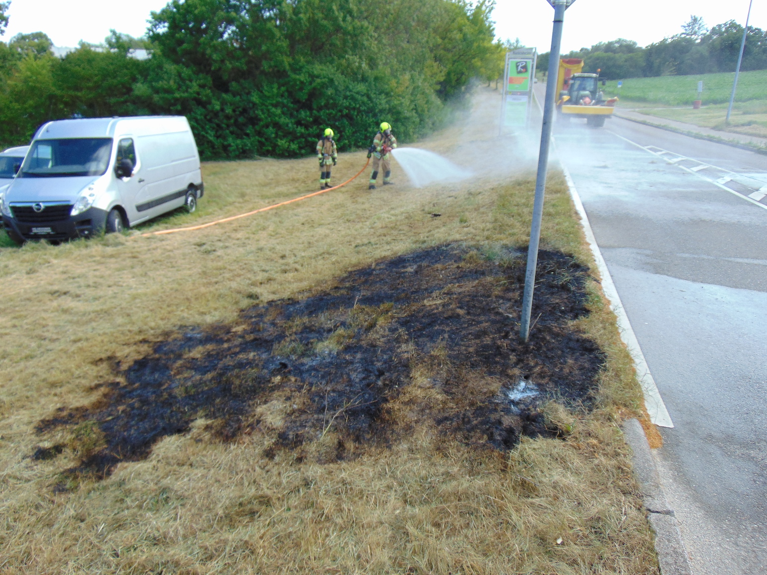 Vermutlich durch eine achtlos weggeworfene Zigarettenkippe und der trockenen Jahreszeit hat sich ein Flächenbrand gebildet. Durch den Wind wurde der kleine Brand schnell angefacht. Da dieses Wiesenstück von einem benachbarten Autohaus als Abstellfläche neuer Fahrzeuge genutzt wird, entstand eine gefährliche Situation. Durch das beherzte Eingreifen der Autohausmitarbeiter unter Verwendung ihrer Feuerlöscher, konnte der Brand jedoch schnell und effektiv eingedämmt werden, sodass keine Fahrzeuge beschädigt wurden. Die Einsatzkräfte mussten lediglich noch Nachlöscharbeiten durchführen und konnten den Einsatz schnell beenden.