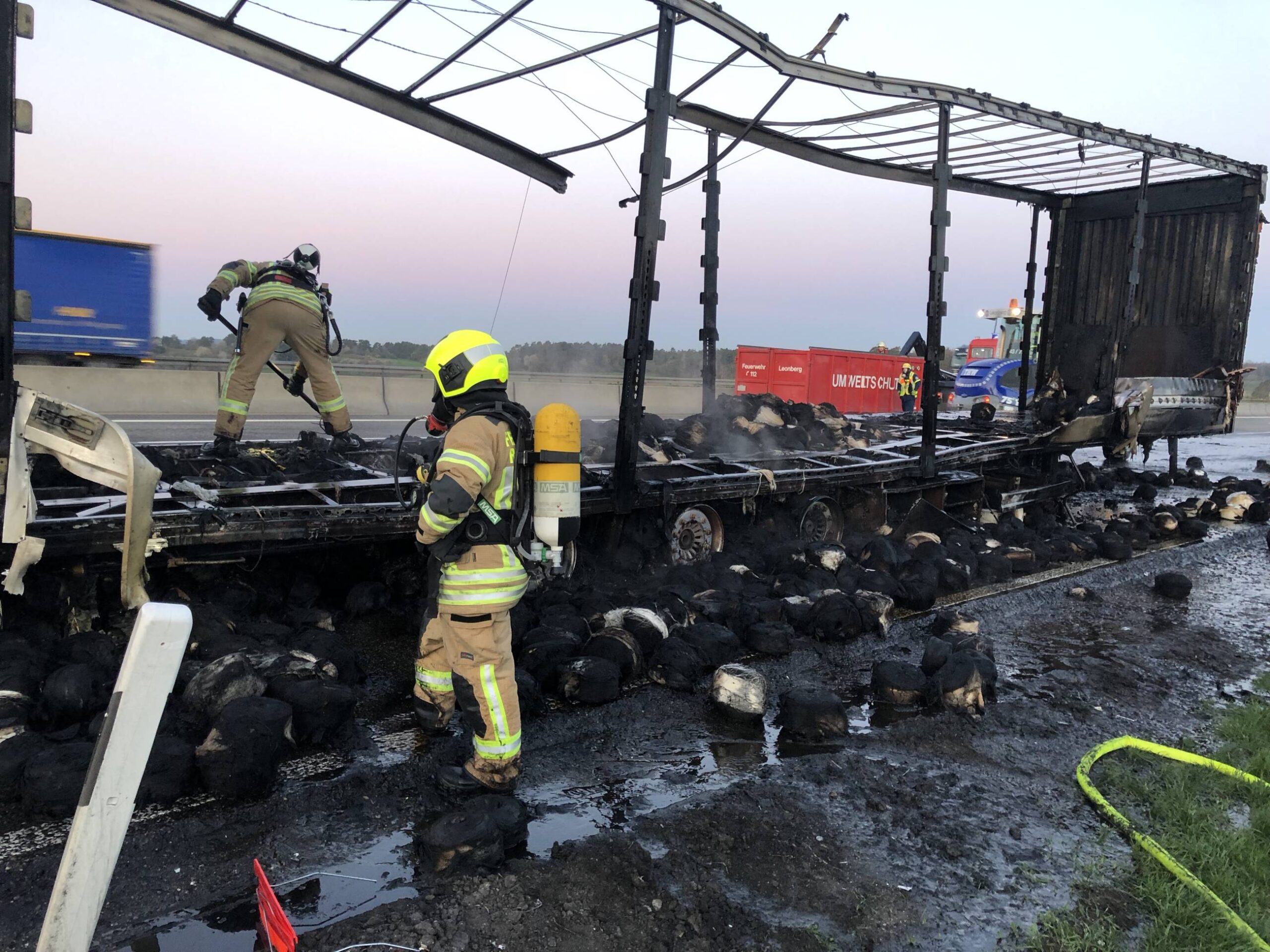 Ein LKW, beladen mit 21 Tonnen Baumwollspulen stand dort im Vollbrand. Der Fahrer konnte glücklicherweise die Zugmaschine noch abkuppeln. Dabei zog er sich jedoch Verbrennungen an einer seiner beiden Hände zu und wurde ins Krankenhaus gebracht. Die ersten Einsatzkräfte begannen umgehend mit der Brandbekämpfung. Um genug Löschwasser an die Einsatzstelle zu bekommen, wurde ein Pendelverkehr mit drei Löschfahrzeugen zum nahegelegenen Industriegebiet in Heimsheim eingerichtet. Die Ladung musste mit Hilfe eines Radladers vom THW auf Mulden umgeladen und im Industriegebiet Heimsheim abgelöscht werden. Die Aufräumarbeiten zogen sich bis ca. 9:00 Uhr morgens.