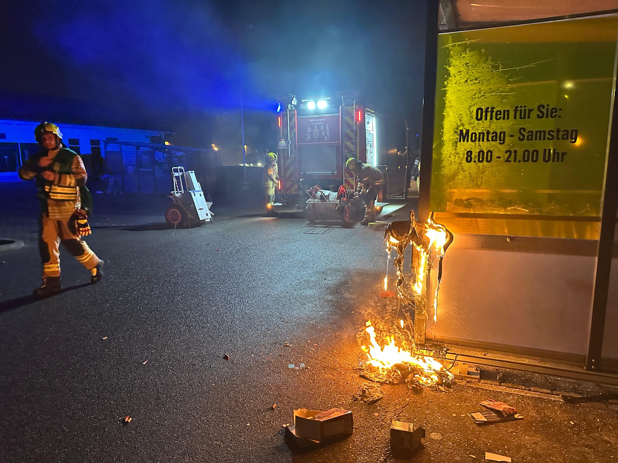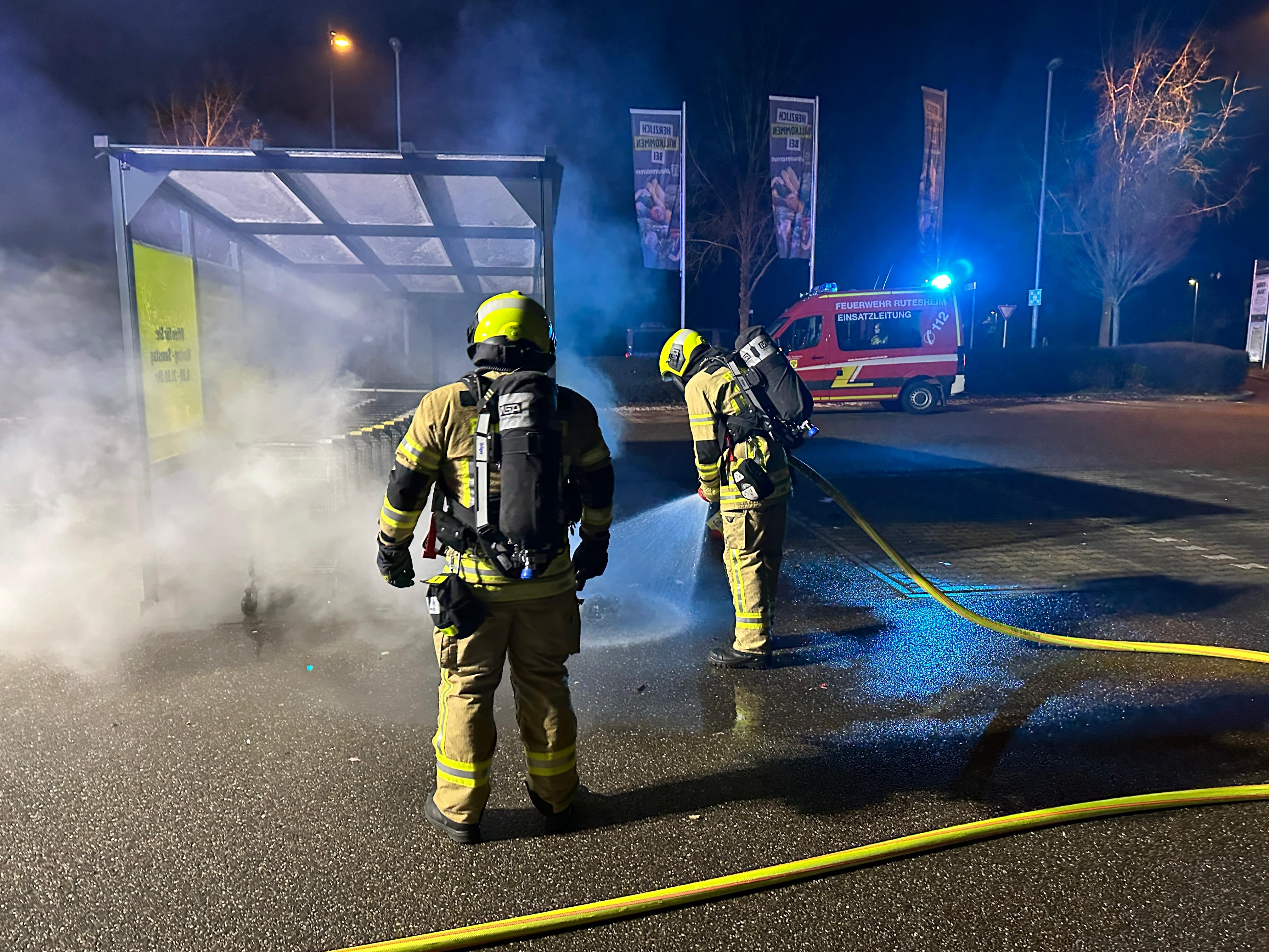 In der Neujahrsnacht wurde die Feuerwehr Rutesheim mit dem Stichwort 1BI in die Gutenbergstraße zum dort ansässigen Lebensmittelmarkt alarmiert. Auf dem Parkplatz wurde ein brennender Mülleimer gemeldet.
