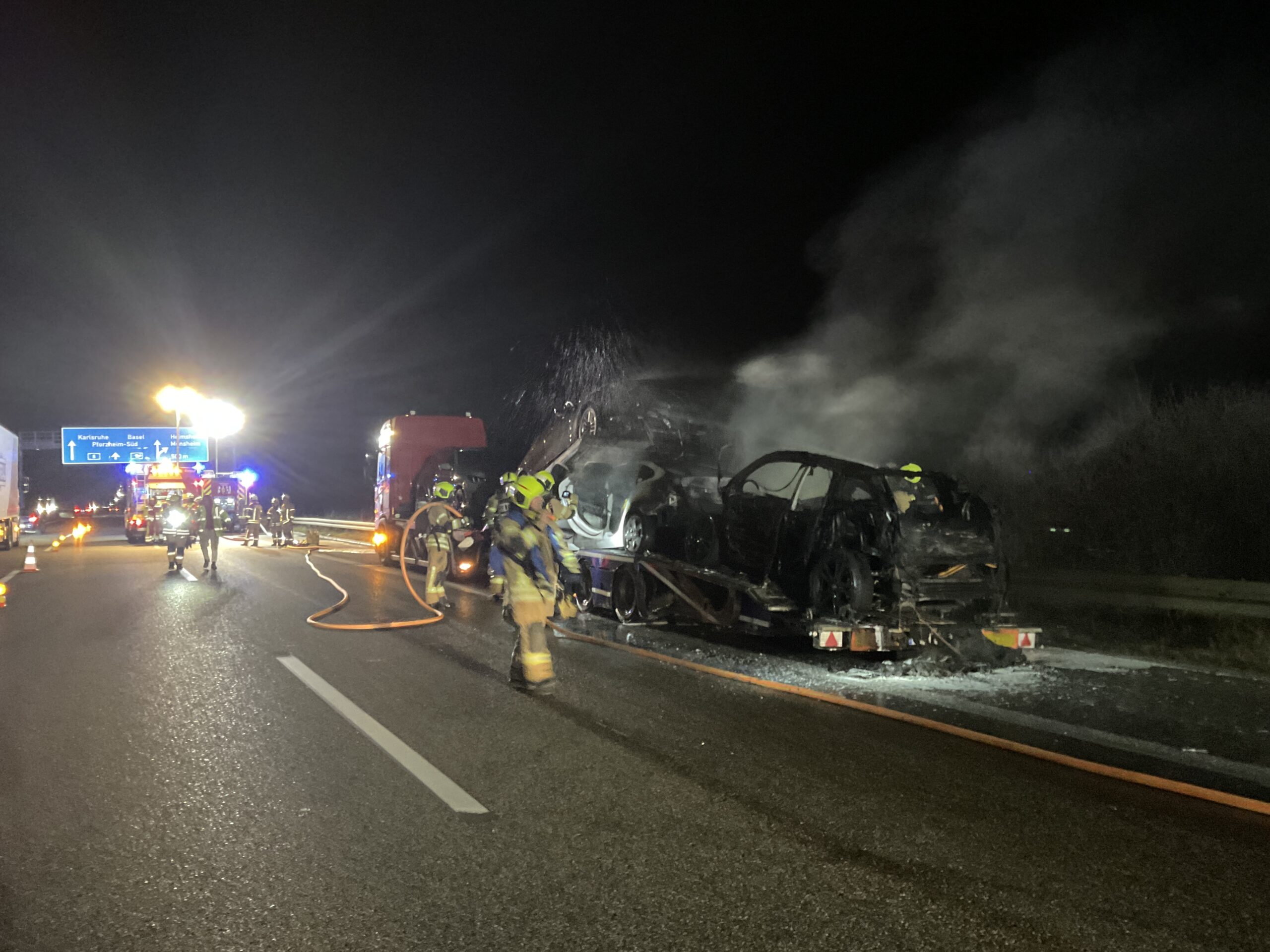 Beim Eintreffen der ersten Einsatzkräfte stellte sich heraus, dass es sich nicht um den gesamten LKW, sondern um drei auf einem Autotransporter verladenen PKW handelte, die in voller Ausdehnung brannten. Im weiteren Verlauf wurde bekannt, dass es sich bei den betroffenen Fahrzeugen um Elektrofahrzeuge handelte.