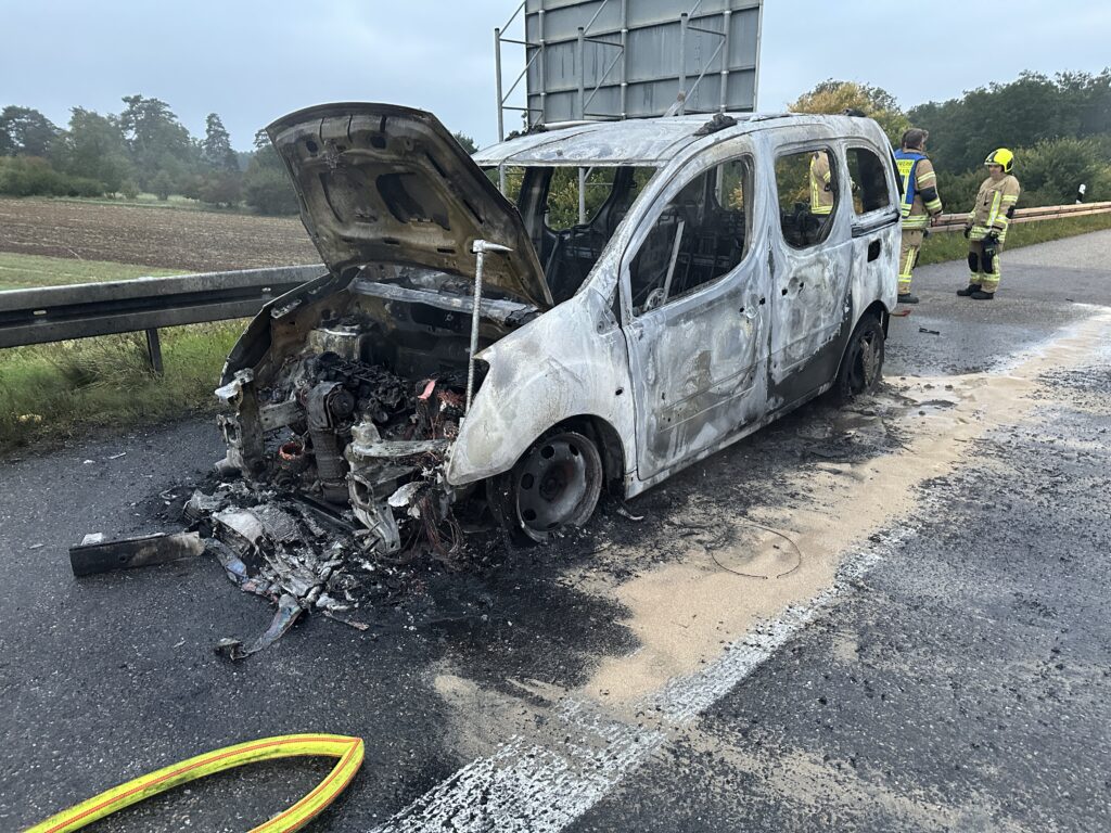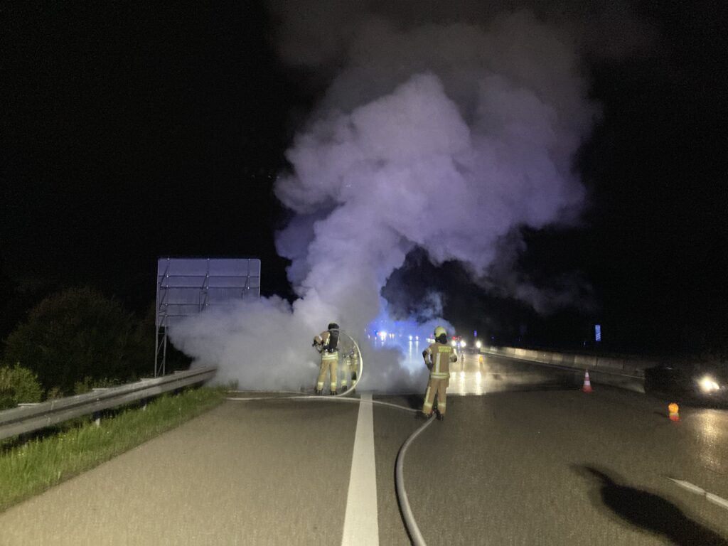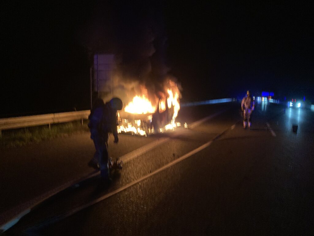 Am Samstagmorgen wurde die Feuerwehr Rutesheim mit dem Alarmstichwort 1 BA auf die Bundesautobahn 8 alarmiert. Kurz vor dem Parkplatz Heckengäu stand auf dem Standstreifen ein PKW in Vollbrand.