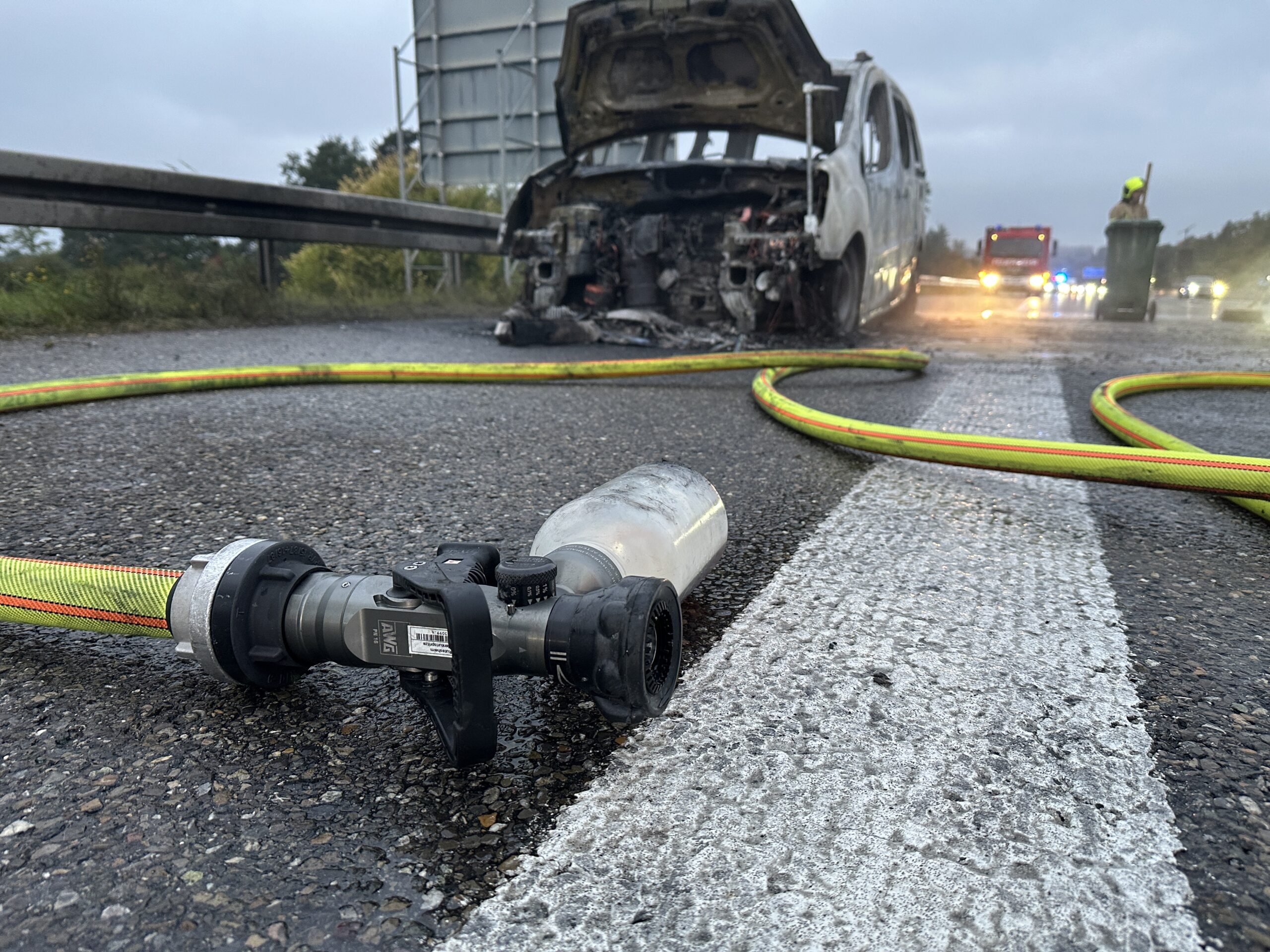 Zur Unterstützung war außerdem der Gerätewagen-Transport in Form der Einsatzstellenhygiene im Einsatz. Dieser brachte frische Ersatzkleidung an die Einsatzstelle und übernahm den Abtransport der kontaminierten Ausrüstung. Während der gesamten Maßnahmen blieben die rechte und die mittlere Fahrspur gesperrt.