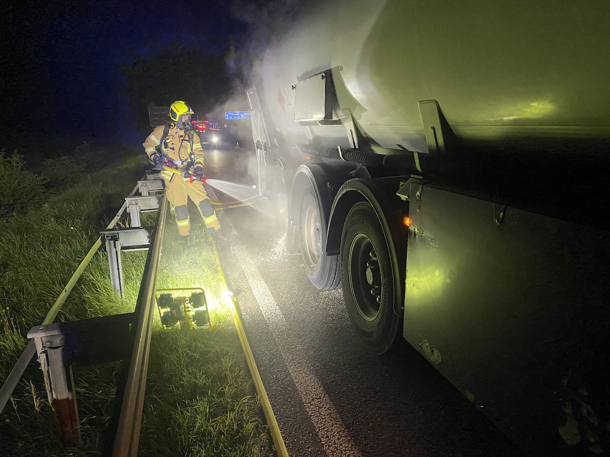 Ein Sattelzugfahrer bemerkte beim Bremsvorgang auf der BAB 8 in Fahrtrichtung Stuttgart eine Rauchentwicklung an den hinteren Achsen und lenkte seinen Tanklastzug ca. 100m vor dem Parkplatz Heckengäu auf den Seitenstreifen. Direkt nach dem Anhalten geriet die hintere Bremsanlage in Brand. Dieser konnte mit Hilfe eines Feuerlöschers vom Fahrer selbst gelöscht werden. Bei Eintreffen der Rutesheimer Einsatzkräfte wurde die Bremsanlage von einem Trupp unter schwerem Atemschutz mit der Wärmebildkamera kontrolliert und mit einem C-Rohr weiter abgekühlt. Nachdem die Bremsanlage auf eine unkritische Temperatur abgekühlt worden war, wurde der Sattelzug noch auf den nahegelegenen Parkplatz begleitet und kurze Zeit beobachtet. Die Einsatzstelle wurde abschließend der Autobahnpolizei übergeben.