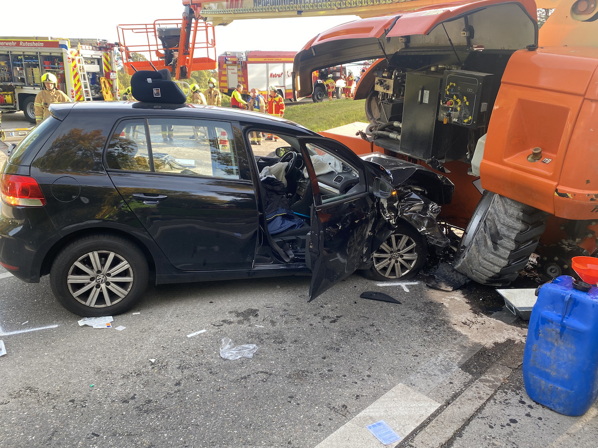 Bei Eintreffen wurde ein PKW vorgefunden, der frontal in eine die Straße überquerende Arbeitsbühne gefahren war. Innerhalb des Fahrzeugs waren konnten zwei Personen vorgefunden werden. Im Korb der Arbeitsbühne lag zudem ein weiterer Verletzter. Es konnte schnell erkundet werden, dass beide Fahrzeuginsassen glücklicherweise nur eingeschlossen und nicht eingeklemmt waren. Der Beifahrer wurde bereits durch den Rettungsdienst versorgt. Die Fahrerin war die ganze Zeit über ansprechbar und bei Bewusstsein. Für diese wurde dann eine achsengerechte und schonende Rettung eingeleitet und anschließend dem Rettungsdienst übergeben. Parallel kümmerten sich die Kameradinnen und Kameraden aus Leonberg um den Verletzten im Korb der Arbeitsbühne mittels Rettungsplattform. Der Beifahrer erlag trotz aller Bemühungen leider noch vor Ort seinen Verletzungen.