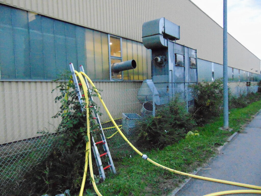 Vor Ort konnte eine Absauganlage außerhalb einer Industriehalle ausgemacht werden, die bereits in voller Ausdehnung brannte. Die Halle selber wurde dadurch im Verlauf stark verraucht. Die Absauganlage wurde von der Umgehungsstraße her mit zwei Trupps unter schwerem Atemschutzgerät abgelöscht. Zeitgleich wurde die Halle mit zwei weiteren Trupps und einer Wärmebildkamera abgesucht und Rauchabzüge geöffnet. Da nicht ausgeschlossen werden konnte, ob sich im Rohrsystem der Anlage noch Glutnester befinden, wurden die Rohre an mehreren Stellen geöffnet und kontrolliert. Abschließend wurde die Einsatzstelle dem Geschäftsführer übergeben.