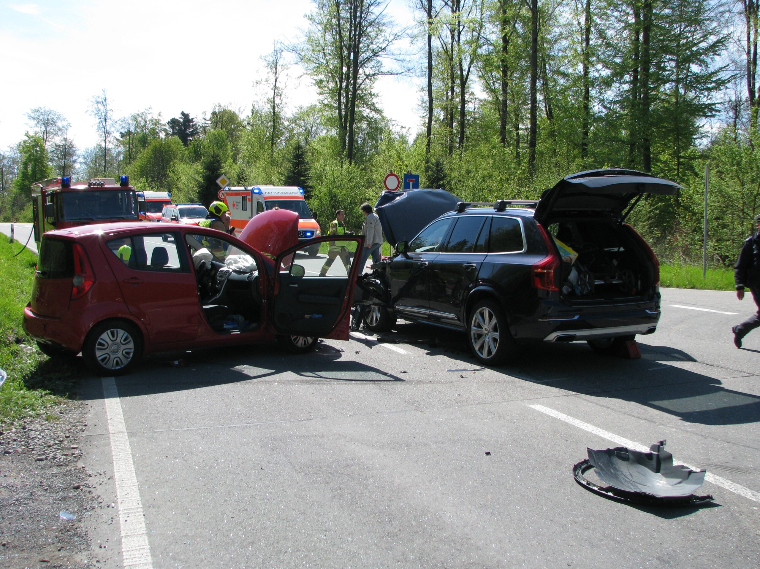 An dem Kreuzungsbereich waren zwei Fahrzeuge kollidiert. Eine Person wurde im Fahrzeug eingeschlossen. Die Türe konnte glücklicherweise aber noch vor Eintreffen der ersten Rettungskräfte geöffnet werden. Zwei Personen wurden bei dem Unfall verletzt. Zwei Kinder, die sich ebenfalls in einem der Fahrzeuge befanden, konnten unverletzt das Fahrzeug verlassen. Der Brandschutz wurde sichergestellt, die Batterien abgeklemmt und die Einsatzstelle bis zum Abtransport der beiden Fahrzeuge gesichert. Abschließend wurde die Einsatzstelle der Polizei übergeben.